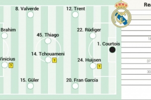 附阿斯預測皇馬首發:1-庫爾圖瓦;20-弗蘭·加西亞、24-赫伊森、22-呂迪格、12-阿諾德;15-居萊爾、14-瓊阿梅尼、45-蒂亞戈·皮塔奇、8-巴爾韋德;7-維尼修斯、21-卜拉欣·迪亞斯