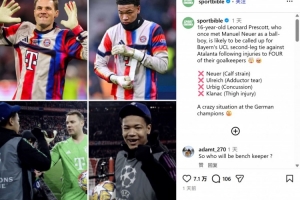 RMC:拜仁16歲門將普雷斯科特幾周前擔任球童,如今有望出戰歐冠