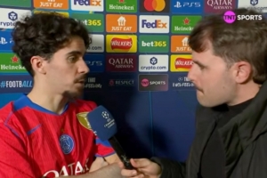 體育資訊3月18日訊 歐冠1/8決賽次回合,巴黎客場(chǎng)3比0擊敗切爾西,總比分8比2大勝晉級(jí)8強(qiáng)。賽后,巴黎中場(chǎng)維蒂尼亞接受了TNT體育的采訪。