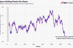 熱刺在過去的38場(chǎng)英超比賽中僅積33分。場(chǎng)均0.87分的得分率是該俱樂部整個(gè)聯(lián)賽歷史上在連續(xù)38場(chǎng)比賽跨度內(nèi)的最低紀(jì)錄(按勝場(chǎng)積3分計(jì)算),追平了其在1912年和1915年創(chuàng)下的戰(zhàn)績(jī)。