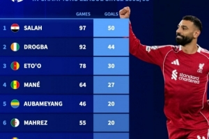 歐冠改制后非洲球員射手榜:薩拉赫50球居首,德羅巴、埃托奧前三