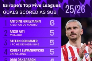 本賽季五大聯(lián)賽替補(bǔ)登場(chǎng)球員進(jìn)球數(shù)排行:格列茲曼以6球居首