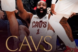 砍36+7+9帶隊贏球!騎士發布贏球海報:封面為哈登被隊友拉起瞬間
