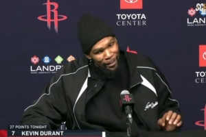 體育資訊3月22日訊 NBA常規賽,火箭主場123-122險勝熱火。賽后杜蘭特接受采訪,他透露隊友們在更衣室潑水為他慶祝得分超越喬丹的里程碑。