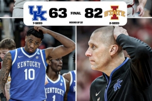 體育資訊3月23日訊 今日瘋三32強賽,愛荷華州立大學以82比63大勝肯塔基大學,再次將這支傳統勁旅擋在甜蜜16強門外。