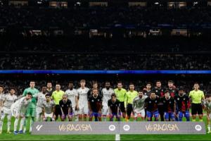皇馬官推曬出賽前反種族歧視活動的合影,并配文:“團結(jié)起來反對種族歧視。”