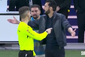 皇馬球員們滿臉難以置信,看臺上噓聲震天,替補席上的阿韋洛亞更是毫不掩飾對裁判判罰的不滿。此時,主裁判主動走向阿韋洛亞,向他解釋直接出示紅牌的判罰依據(jù)。