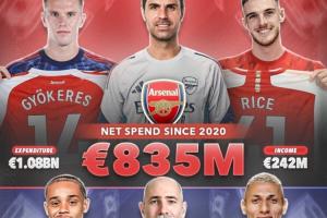 據Score90統計,自2020年以來,阿森納在轉會市場引援共花費10.8億歐元,收入2.42億歐元,凈支出8.35億歐元;而熱刺共花費11.1億歐元,收入3.46億歐元,凈支出7.63億歐元。
