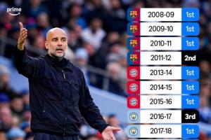 據轉播商亞馬遜統計,瓜迪奧拉執教生涯至今從未連續兩個賽季無緣聯賽冠軍。