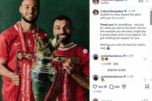 體育資訊3月25日訊 薩拉赫將在本賽季結束后離開利物浦,隊友加克波社媒發文致敬。