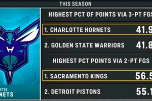 本賽季黃蜂三分命中數占比聯盟最多 國王兩分命中數占比聯盟最多