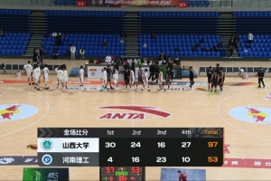末節山西大學重新掌控局勢,他們高壓防守讓原本有所回暖的河南理工再度陷入啞火,后者6分鐘里僅得6分沒能繼續蠶食分差,山西大學這邊不斷制造殺傷罰球搶分,王昱翔和史悅龍相繼命中三分,山西大學送上一波21-6的攻勢徹底殺死比賽懸念。最終,山西大學97-53大勝河南理工收獲五連勝。