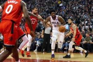 2019年?yáng)|部半決賽,恩比德場(chǎng)均17.6分8.7籃板3.3助攻,投籃命中率僅37%。