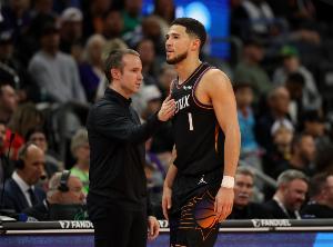 布克全場出戰(zhàn)35分20秒,21投10中(三分12中5)、罰球8中7,轟下全場最高32分外加4籃板4助攻2搶斷,4次失誤瑕不掩瑜,正負(fù)值+1。