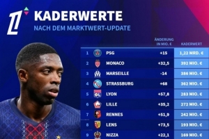 法甲球隊身價排名:巴黎12.2億歐斷層居首,摩納哥3.92億歐次席