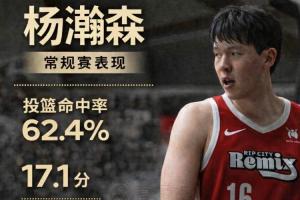 楊瀚森在常規賽出戰了14場,投籃命中率62.4%,三分球32.1%,罰球命中率75%,場均17.1分9.2籃板3.1助攻0.7搶斷1.6蓋帽。