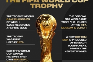 國際足聯科普大力神杯:總重6.142公斤,其中5.092公斤為純金