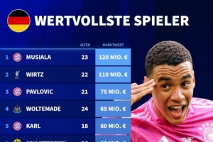 體育資訊3月29日訊 德國轉會市場統計了德國球員的身價,并列出榜單,穆西亞拉1.2億歐居首,維爾茨1.1億歐次席。