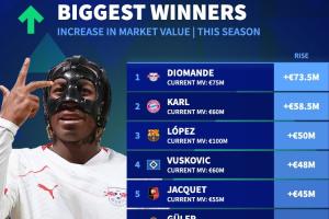 本賽季身價漲幅TOP10:迪奧曼德、卡爾前2,費爾明翻倍到1億