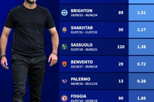體育資訊3月31日訊 熱刺接近任命德澤爾比為球隊主帥,德國轉會市場盤點了意大利教頭執教生涯的場均拿分情況,在頓涅茨克礦工場均2.17分居首。