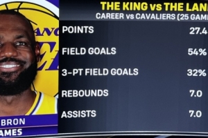 湖人主場(chǎng)迎戰(zhàn)騎士,轉(zhuǎn)播方曬出詹姆斯生涯VS騎士數(shù)據(jù)統(tǒng)計(jì)(25場(chǎng)):