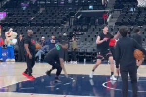 身體對抗有提升?楊瀚森賽前熱身時撞倒黑人助教