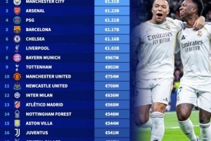 足壇俱樂部最新身價榜:皇馬13.4億歐居首,曼城13.1億歐次之