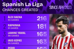亞馬爾西甲首秀以來創造165次機會,僅少于巴埃納、拉菲尼亞
