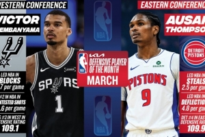 體育資訊4月3日訊 NBA官方公布了3月份的東西部月最佳防守球員,馬刺的文班亞馬和活塞的奧薩爾·湯普森分別當選。