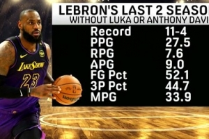 過去兩季在東契奇或AD缺陣時 詹姆斯場均27.5分7.6板9助 11勝4負