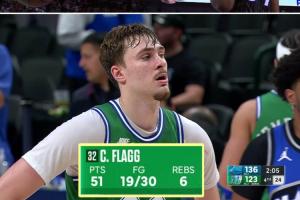 弗拉格全場出戰(zhàn)33分33秒,30投19中(三分9中6)、罰球7中7,狂砍51分6籃板3助攻3搶斷1蓋帽,只有1次失誤,正負值-2。
