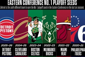 值得一提的是,在過去的六個賽季中,東部第一分別由六支不同的球隊輪流坐,分別是76人、熱火、雄鹿、凱爾特人、騎士、活塞。
