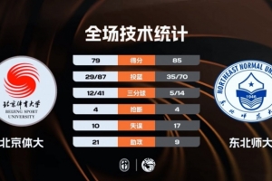末節比賽,東北師大的進攻表現沒有絲毫好轉,可以說是更加糟糕,他們在前七分鐘的時間里只拿到6分,北京體大一波流直接完成反超,比賽懸念打到了最后,關鍵時刻王玖豪命中領先三分球,祖力布哈爾強投三分不中讓北京體大徹底失去機會,最終東北師大85-79險勝北京體大。