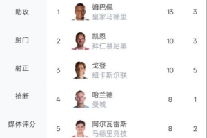 值得注意的是,數據統計顯示,本賽季歐冠到目前為止,射手榜和助攻榜前兩名都是這兩隊的球員(紐卡的安東尼·戈登與凱恩并列射手榜第二)