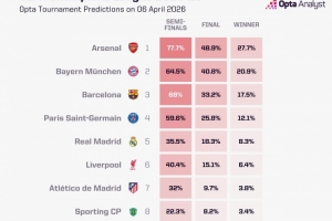Opta預(yù)測晉級歐冠四強概率:槍手77.7%最高,巴薩68%、拜仁64.5%