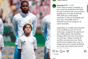 巴坎布社媒曬出自己在國(guó)家隊(duì)的照片,并寫道:“親愛(ài)的剛果兄弟姐妹們,我懷著無(wú)比的感激與自豪向大家宣布——我們的國(guó)家隊(duì)已成功晉級(jí)2026年世界杯!這個(gè)夢(mèng)想,我與你們所有人共同分享。讓我們攜手在世界舞臺(tái)上發(fā)出剛果的聲音。”