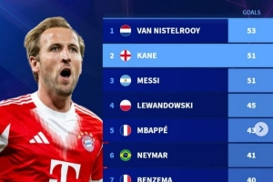 凱恩生涯67場歐冠進51球,相同場次進球數僅次于范尼,與梅西相同