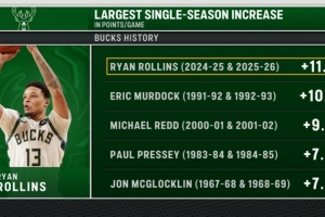 雄鹿隊史單賽季場均得分漲幅榜:羅林斯+11.0第一 里德+9.2第三