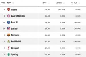 歐冠奪冠概率:槍手36%居首,拜仁巴黎分列二三,巴薩皇馬紅軍5-7