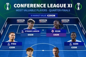 體育資訊4月9日訊 德轉官網公布了本賽季歐協聯1/4決賽身價最高十一人陣容,英超水晶宮獨占九席。德轉對此陣容的解讀也十分簡明扼要:“顯然,這就是水晶宮是本賽季歐協聯冠軍大熱門的原因。”
