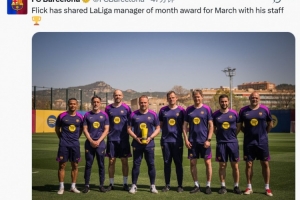 體育資訊4月11日訊 巴薩官方更新動態,弗里克與他的教練團隊領取了西甲官方評出的三月最佳教練獎。這位德國教練在鞏固了聯賽榜首位置后,被西甲聯賽評選為上個月的最佳教練。