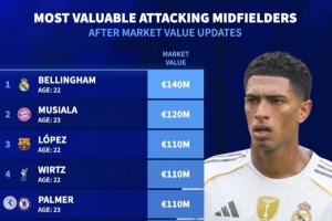 德轉(zhuǎn)列前腰身價榜:貝林厄姆壓穆西亞拉居首,費(fèi)爾明、維爾茨在列