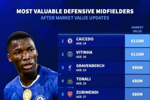 防守型中場德轉身價榜:凱塞多、維蒂尼亞1.1億歐居首