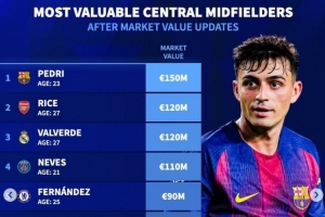 體育資訊4月11日訊 《轉會市場》統計了中前衛位置球員身價情況,佩德里等4人身價均超過1億歐元。