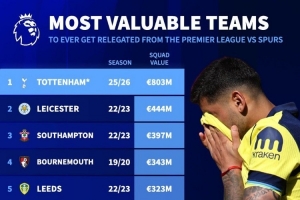 8.03億歐!若熱刺降級,將打破英超降級球隊最高身價紀錄