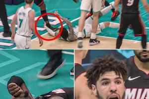 在第二節(jié)的一次進(jìn)攻倒地后,黃蜂球星拉梅洛·鮑爾順勢(shì)抓到了熱火內(nèi)線阿德巴約的腳踝,致使后者失衡重摔在地,隨后返回更衣室。