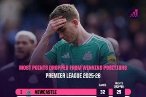體育資訊4月15日訊 數據機構OPTA統計了本賽季英超在領先情況下最終丟分情況,紐卡斯爾25分最多。