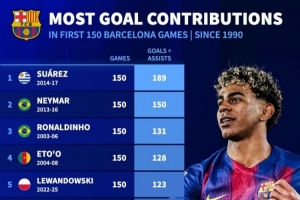1990以來巴薩前150場參與進球榜:蘇牙189球居首 亞馬爾100球第十
