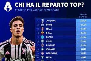 德轉(zhuǎn)列意甲各隊前鋒總身價排行:尤文2.31億歐居首,國米第二