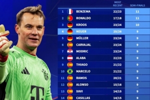體育資訊4月16日訊 今天凌晨,拜仁淘汰皇馬進入歐冠四強,諾伊爾已經9次參加歐冠四強,并列第三。